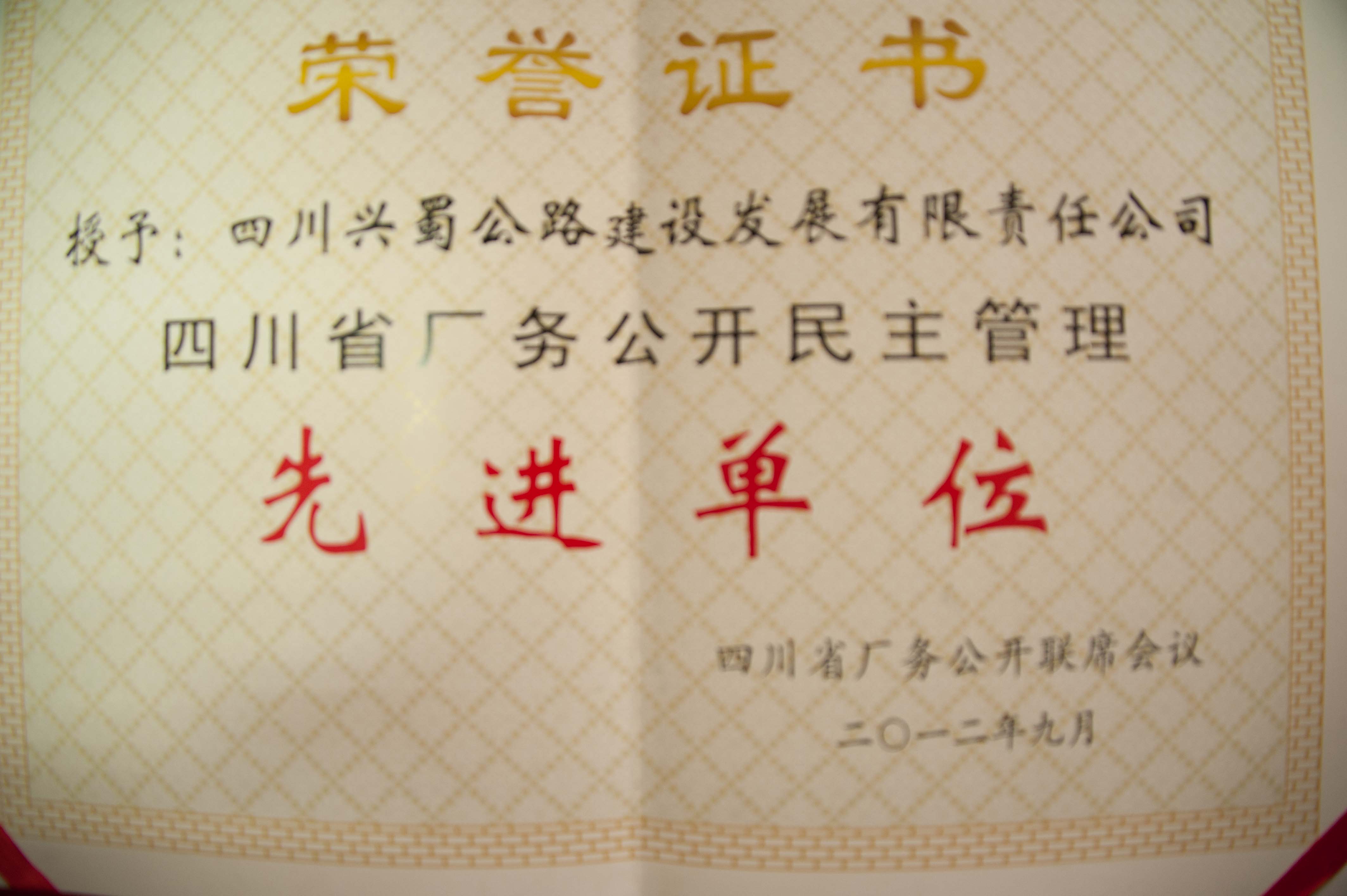 公司日前榮獲“四川省廠務(wù)公開(kāi)民主管理先進(jìn)單位”榮譽(yù)稱號(hào)。