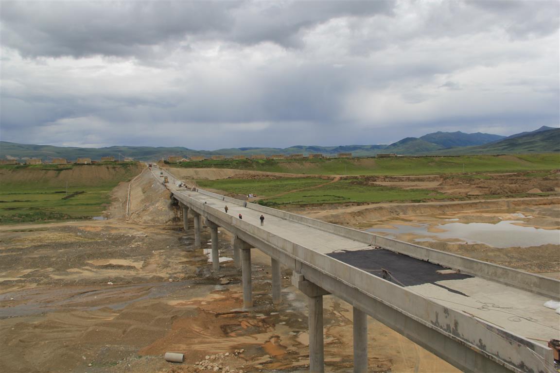 溫泉大橋設計為6跨30米預應力T梁,吊裝重量近80噸。全體參建人員克服高原惡劣的施工條件、交通運輸不便等困難。不斷根據(jù)施工進度情況及時調(diào)整施工作業(yè)方案,保質(zhì)保量地完成了指揮部下達的節(jié)點工期任務。目前大橋橋面已正式移交給路面施工單位進行瀝青砼鋪筑工作。
