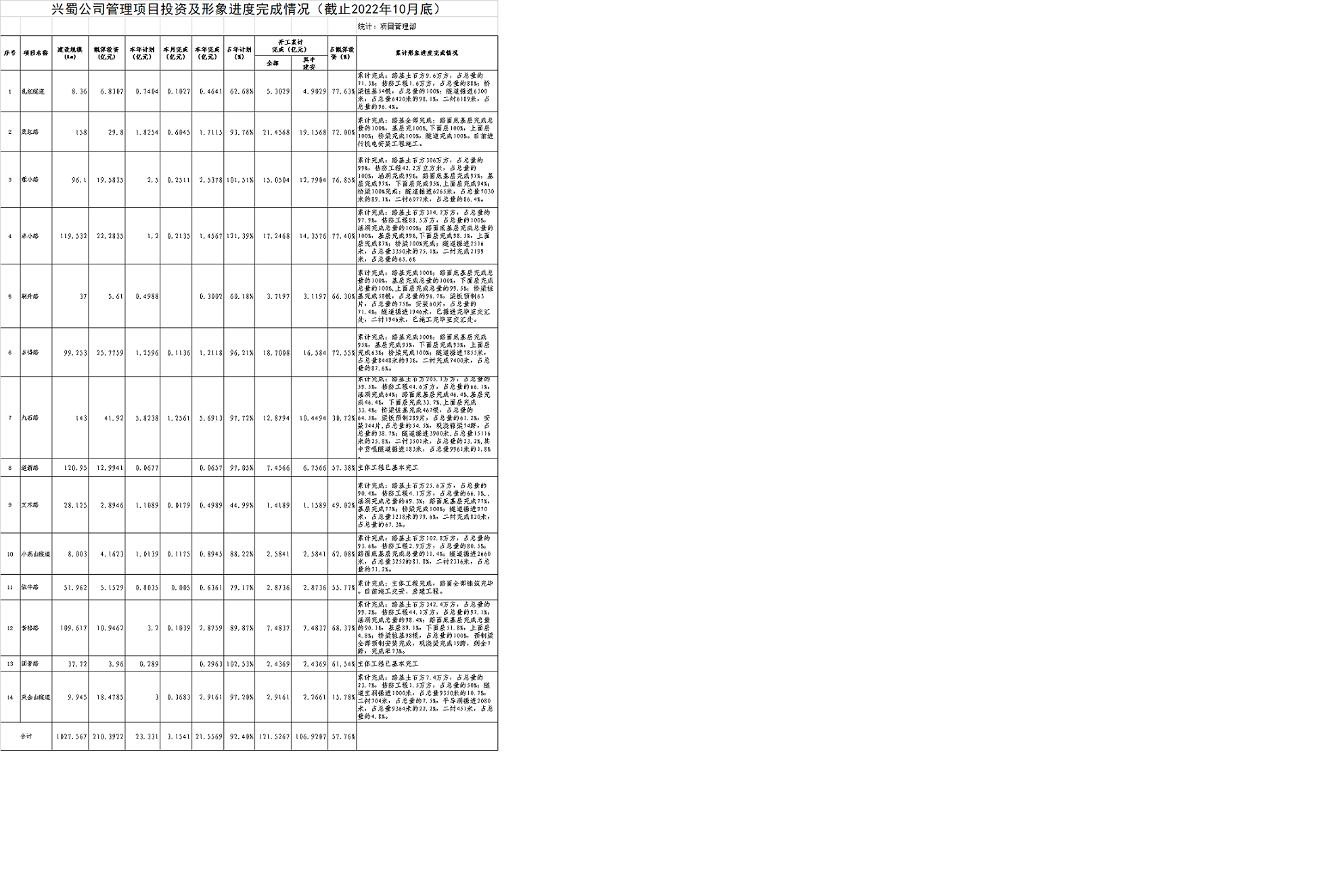 興蜀公司管理項(xiàng)目投資及形象進(jìn)度完成情況(截止2022年10月底)