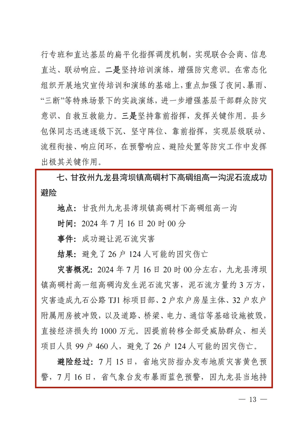 2024 年 7 月 16 日 20 時 00 分左右,興蜀公司代建九石路 TJ1 標(biāo)項目部駐地九龍縣灣壩鎮(zhèn)高碉村高一組高碉溝發(fā)生泥石流災(zāi)害,泥石流方量約 3 萬方, 災(zāi)害造成九石公路 TJ1 標(biāo)項目部、2 戶農(nóng)戶房屋主體、32 戶農(nóng)戶附屬用房被沖毀,以及道路、橋梁、電力、通信等基礎(chǔ)設(shè)施被毀,直接經(jīng)濟損失約 1000 萬元。因預(yù)警到位,相關(guān)項目人員及駐地99 戶460 人提前轉(zhuǎn)移,避免了26 戶124人可能的因災(zāi)傷亡。