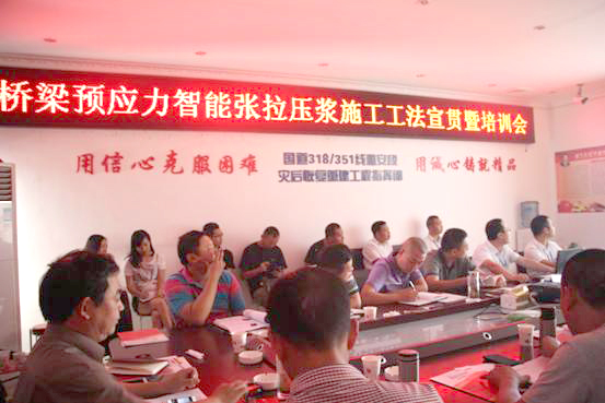為確保橋梁結(jié)構(gòu)的安全性、耐久性,顯著延長預應力結(jié)構(gòu)壽命,改變質(zhì)量監(jiān)管模式,實現(xiàn)標準化、智能化施工。2014年8月14日,興蜀公司雅安災后恢復重建工程國道351線雅安段指揮部召開了橋梁智能張拉、大循環(huán)壓漿工法宣講培訓會。會議從當前中國橋梁安全形勢,威脅橋梁安全的關鍵因素,如何讓橋梁更加安全,預應力智能張拉,大循環(huán)壓漿的使用及推廣情況等方面進行了宣講,為下步橋梁上部結(jié)構(gòu)的施工提供了技術(shù)保障。