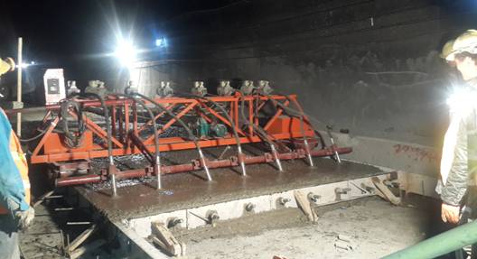 此次鋪筑機械主要采用了三輥軸混凝土攤鋪整平機、排式振搗器和抹平機,模板采用了定型鋼模。