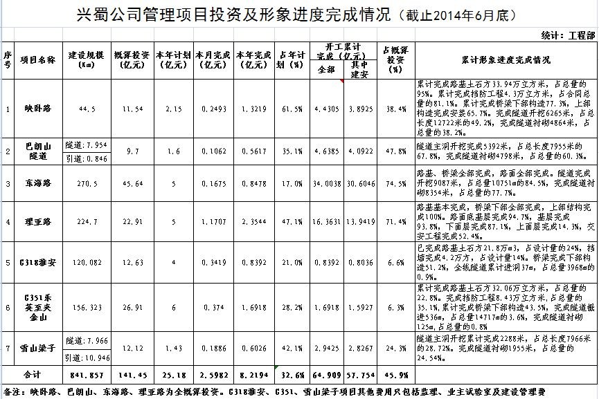 公司管理項(xiàng)目投資及形象進(jìn)度完成情況(截至2014年6月底)