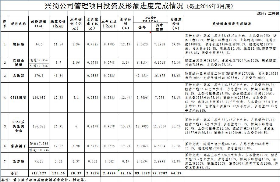 興蜀公司管理項(xiàng)目投資及形象進(jìn)度完成情況(截止2016年3月底)