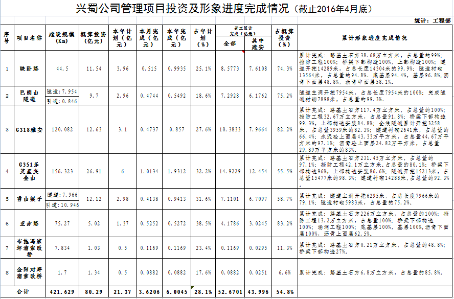 興蜀公司管理項(xiàng)目投資及形象進(jìn)度完成情況(截止2016年4月底)