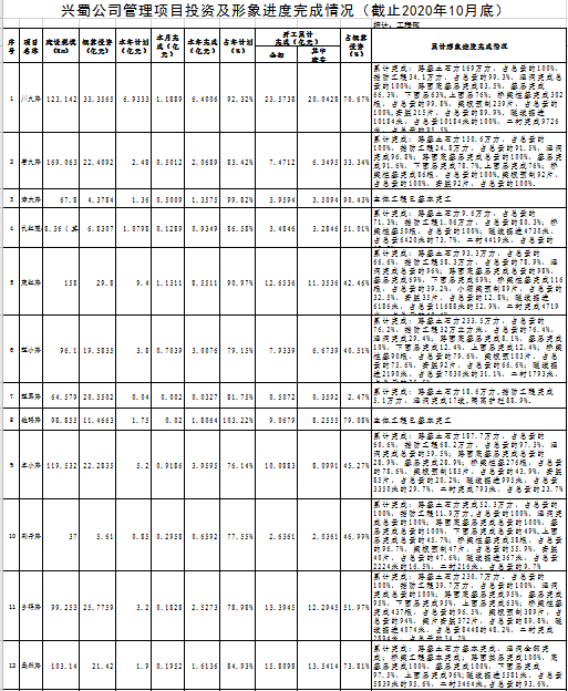 興蜀公司管理項(xiàng)目投資及形象進(jìn)度完成情況(截至2020年10月底)