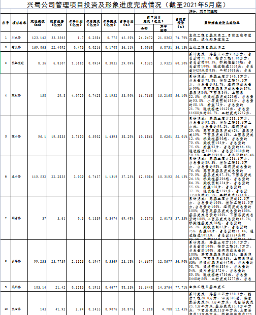 興蜀公司管理項目投資及形象進度完成情況(截至2021年5月底)