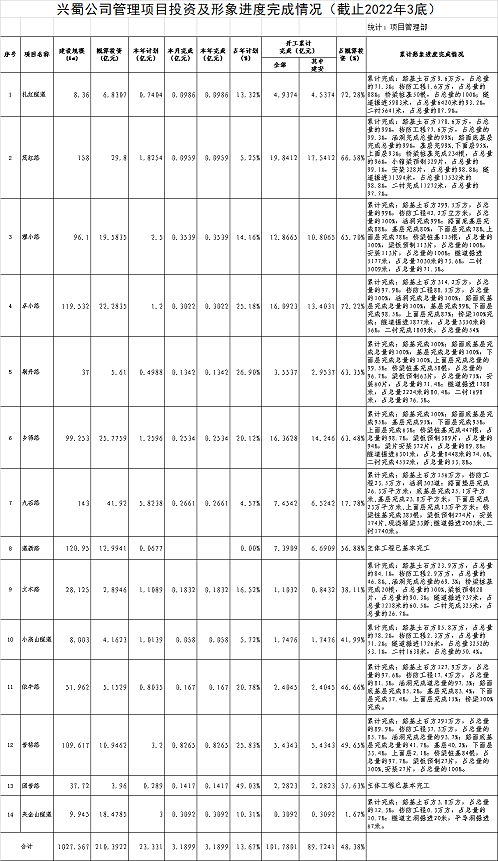 興蜀公司管理項(xiàng)目投資及形象進(jìn)度完成情況(截止2022年3底)
