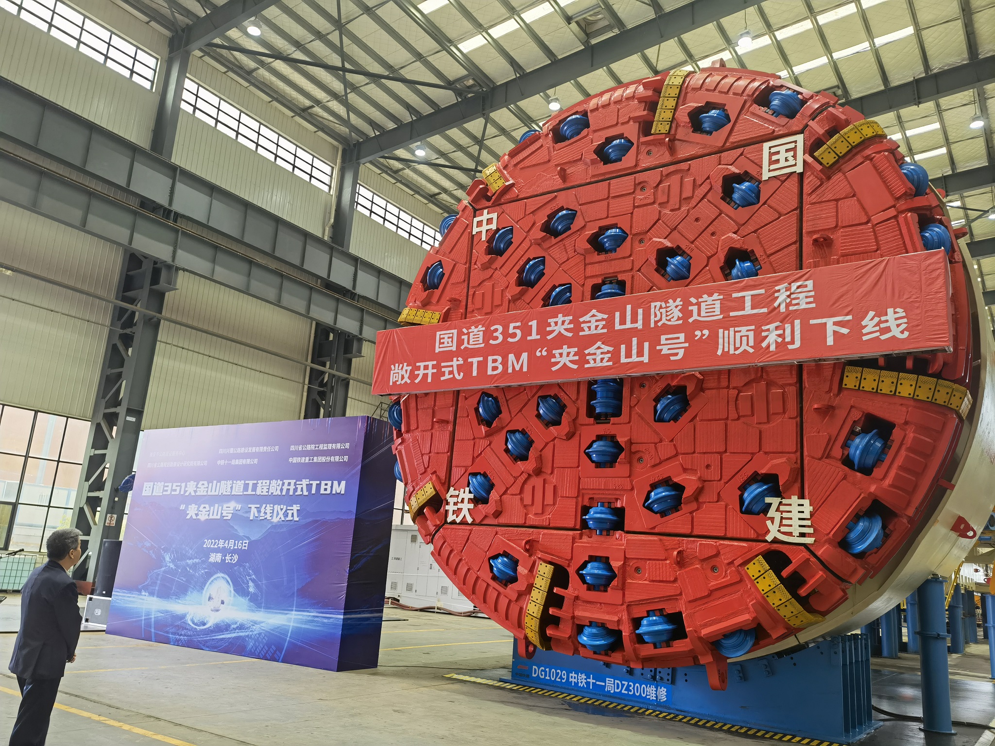 夾金山是中央紅軍長(zhǎng)征途中翻閱的第一座雪山,興蜀公司代建管理的國(guó)道351夾金山隧道工程是四川省委、省政府“我為群眾辦實(shí)事”民生工程,“夾金山號(hào)”TBM的順利下線,標(biāo)志著夾金山隧道平導(dǎo)洞TBM始發(fā)更進(jìn)一步。“夾金山號(hào)”敞開(kāi)式TBM開(kāi)挖直徑7.93m,全長(zhǎng)215米,總重量1600噸。TBM從結(jié)構(gòu)上分為主機(jī)、橋架(連接橋、噴混橋)和后配套三個(gè)部分。主要由刀盤、刀盤支撐、護(hù)盾、主軸承、驅(qū)動(dòng)系統(tǒng)、主梁、水平支撐、撐靴、后支撐等組成。后配套系統(tǒng)由軌行式門架結(jié)構(gòu)臺(tái)車組成,后配套臺(tái)車上布置變壓器、配電柜、電纜水管卷筒、除塵通風(fēng)設(shè)備等。