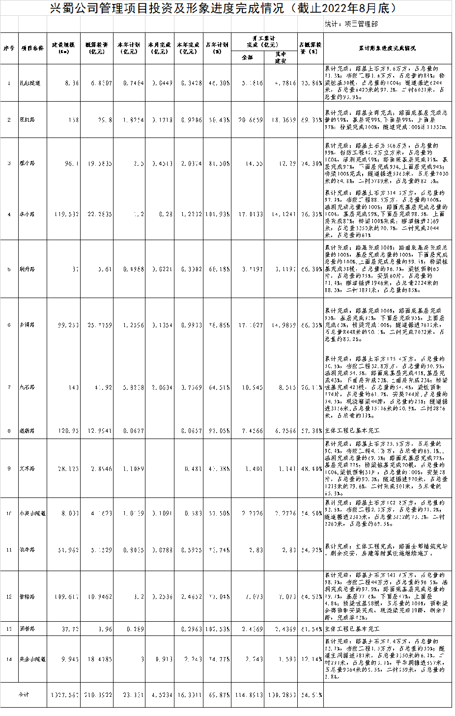 興蜀公司管理項目投資及形象進度完成情況(截止2022年8月底)