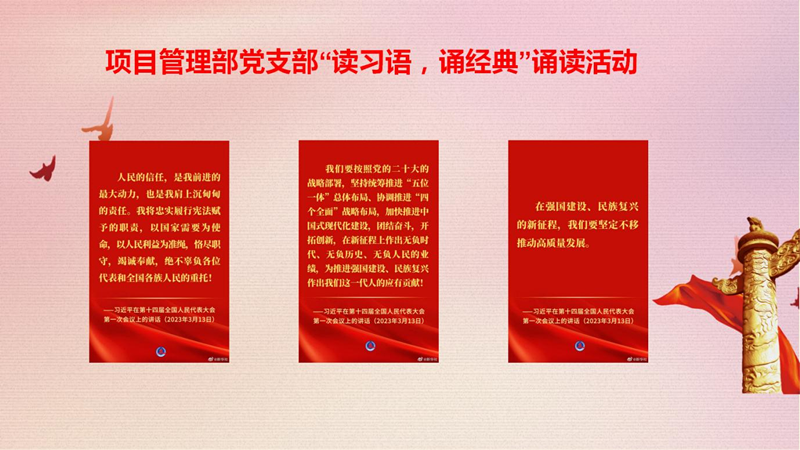 為深入學(xué)習(xí)貫徹習(xí)近平新時(shí)代中國(guó)特色社會(huì)主義思想,結(jié)合主題教育活動(dòng),牢記習(xí)近平總書記對(duì)當(dāng)代青年的殷切囑托,教育引導(dǎo)黨員干部感悟?yàn)槊袂閼?、發(fā)揚(yáng)革命精神,激發(fā)干事創(chuàng)業(yè)熱情,勇?lián)鷷r(shí)代使命,5月12日,項(xiàng)目管理部黨支部組織支部黨員在公司開展“讀習(xí)語(yǔ)、誦經(jīng)典”誦讀活動(dòng)。